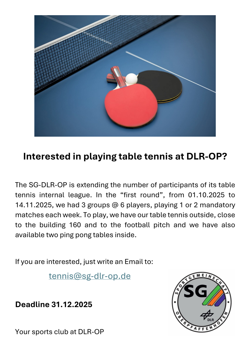 Die Sportgemeinschaft des Deutschen Zentrums für Luft- und Raumfahrt e.V. (DLR) in Oberpfaffenhofen (OP) besteht seit 1970 und bietet den Mitarbeitern/innen vom DLR und anderen Firmen, im und um den DLR Standort in Oberpfaffenhofen, sowie ihren Familienangehörigen und Gästen, Gelegenheit zu sportlicher Betätigung.